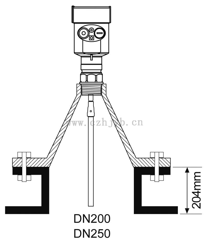 導波雷達物位計可采用螺紋連接,螺紋的長度不要超過15mm,還可以采用在短管上安裝。安裝短管直徑在2″至6″則安裝短管高度應≤100mm(螺紋及短管的長度越短,測量越穩(wěn)定),若安裝短管較長,理想狀態(tài)應將短管割短,或底部固定纜式探頭及選用絕緣對中支架以避免纜式探頭與短管末端接觸。