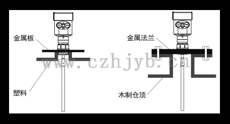 無論是纜式或桿式,若想導波雷達工作正常,過程連接表面應為金屬。當導波雷達裝在塑料罐上時,若罐頂也是塑料或其它非導電材質(zhì)時,儀表需要配金屬法蘭,若采用螺紋連接,需配一塊金屬板。