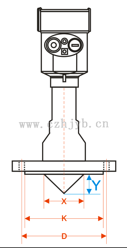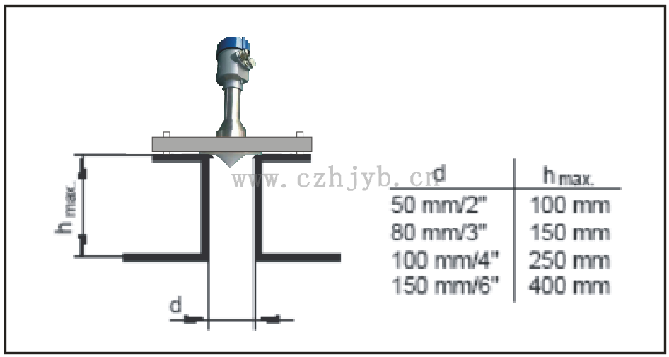注:使用雷達(dá)物位計(jì)時(shí),務(wù)必保證最高料位不能進(jìn)入測(cè)量盲區(qū)(圖中D所示區(qū)域)。