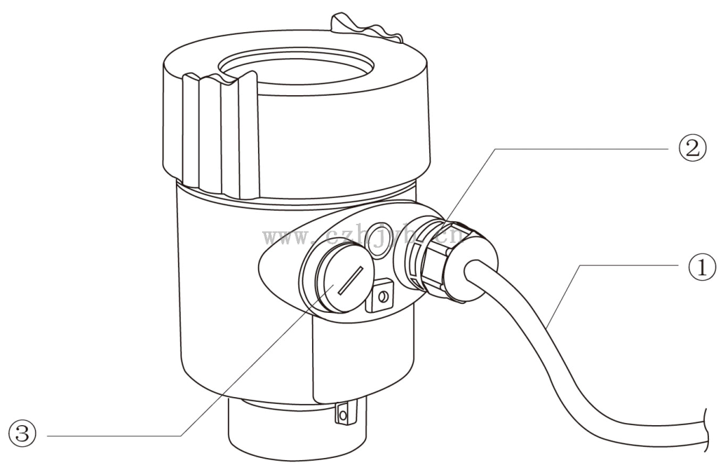 在進(jìn)入電氣接口前,將電纜向下彎曲,以確保水不會(huì)流入殼體,見(jiàn)①